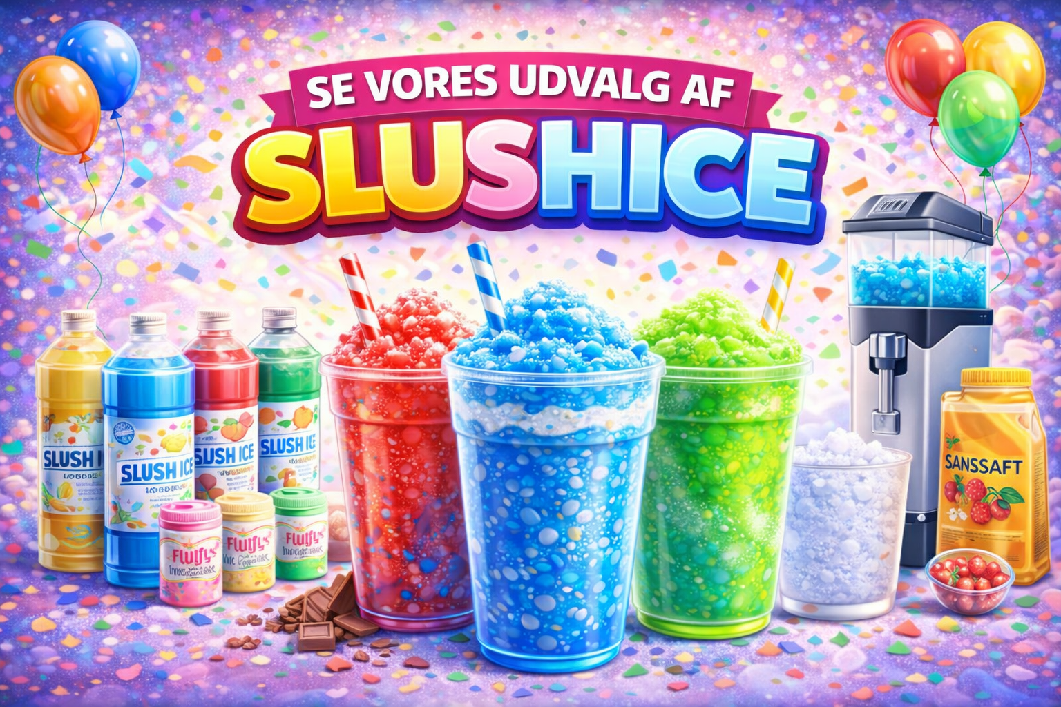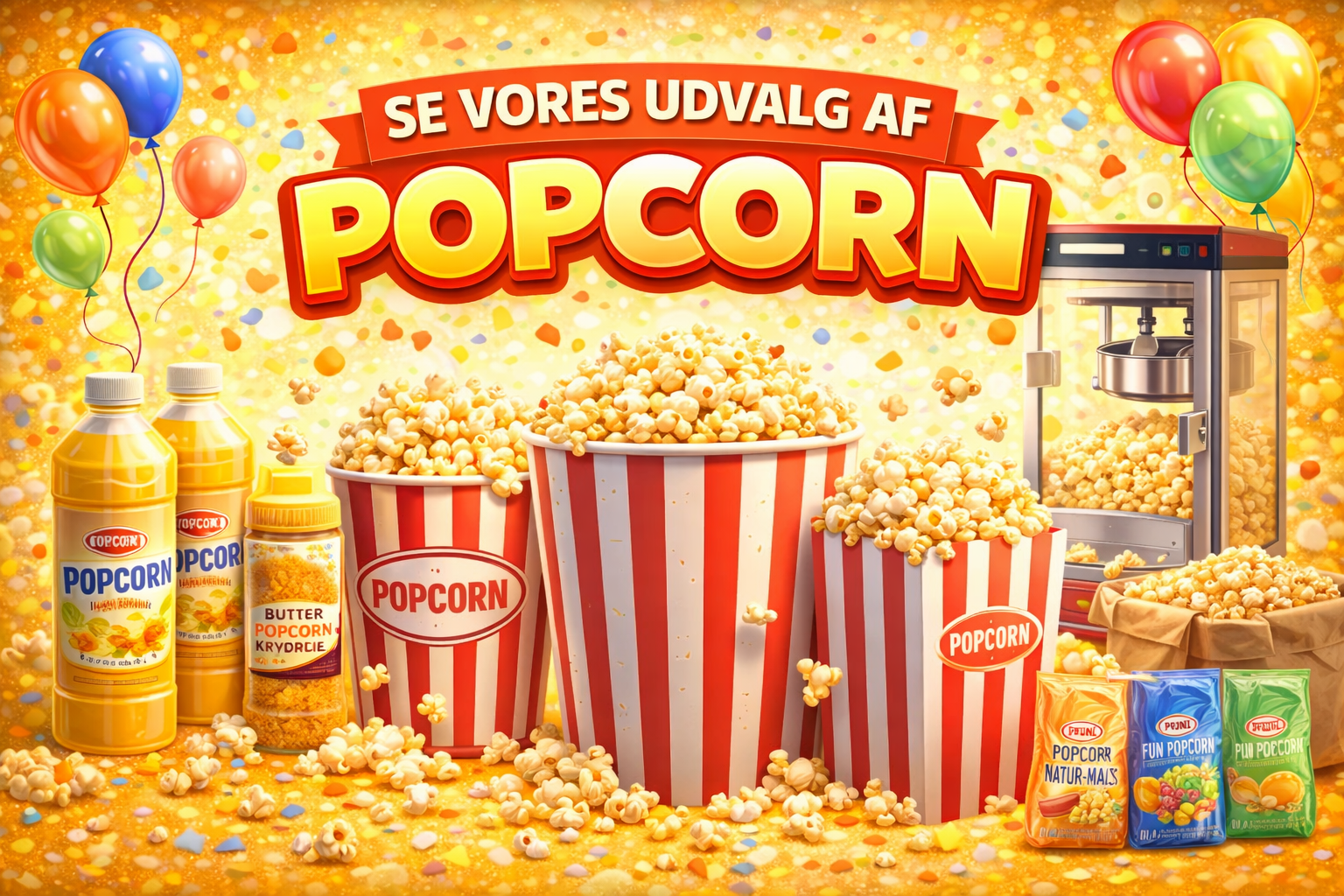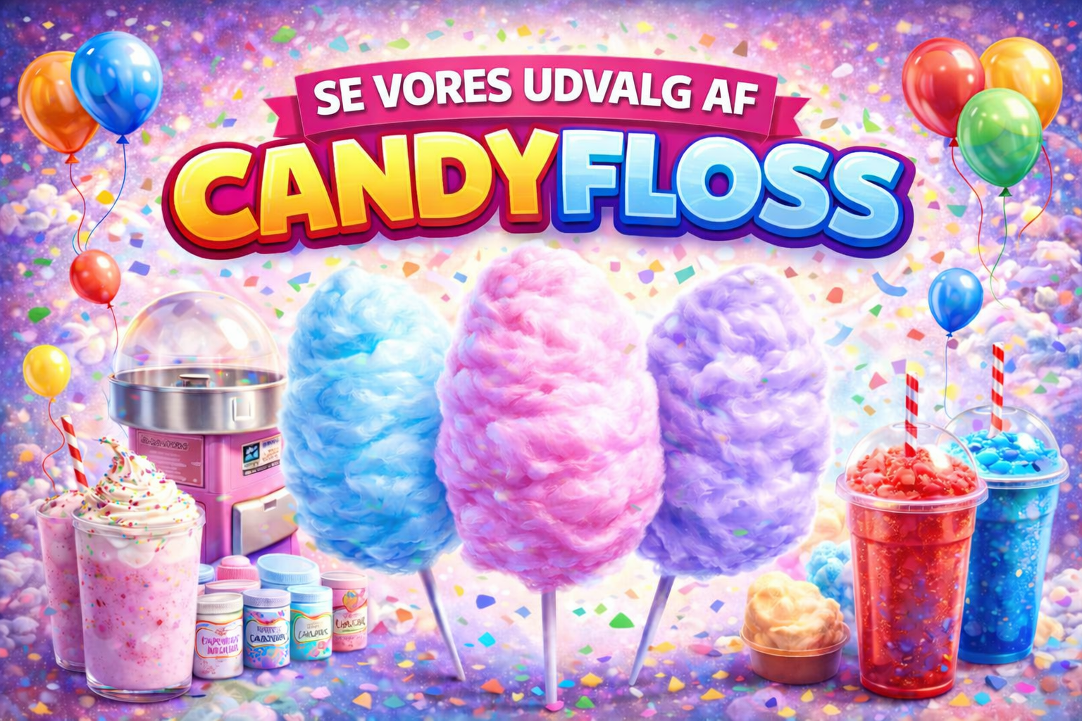 Her finder du et stort udvalg af maskiner og tilbehør til Candyfloss, Popcorn, Softice, Slushice.